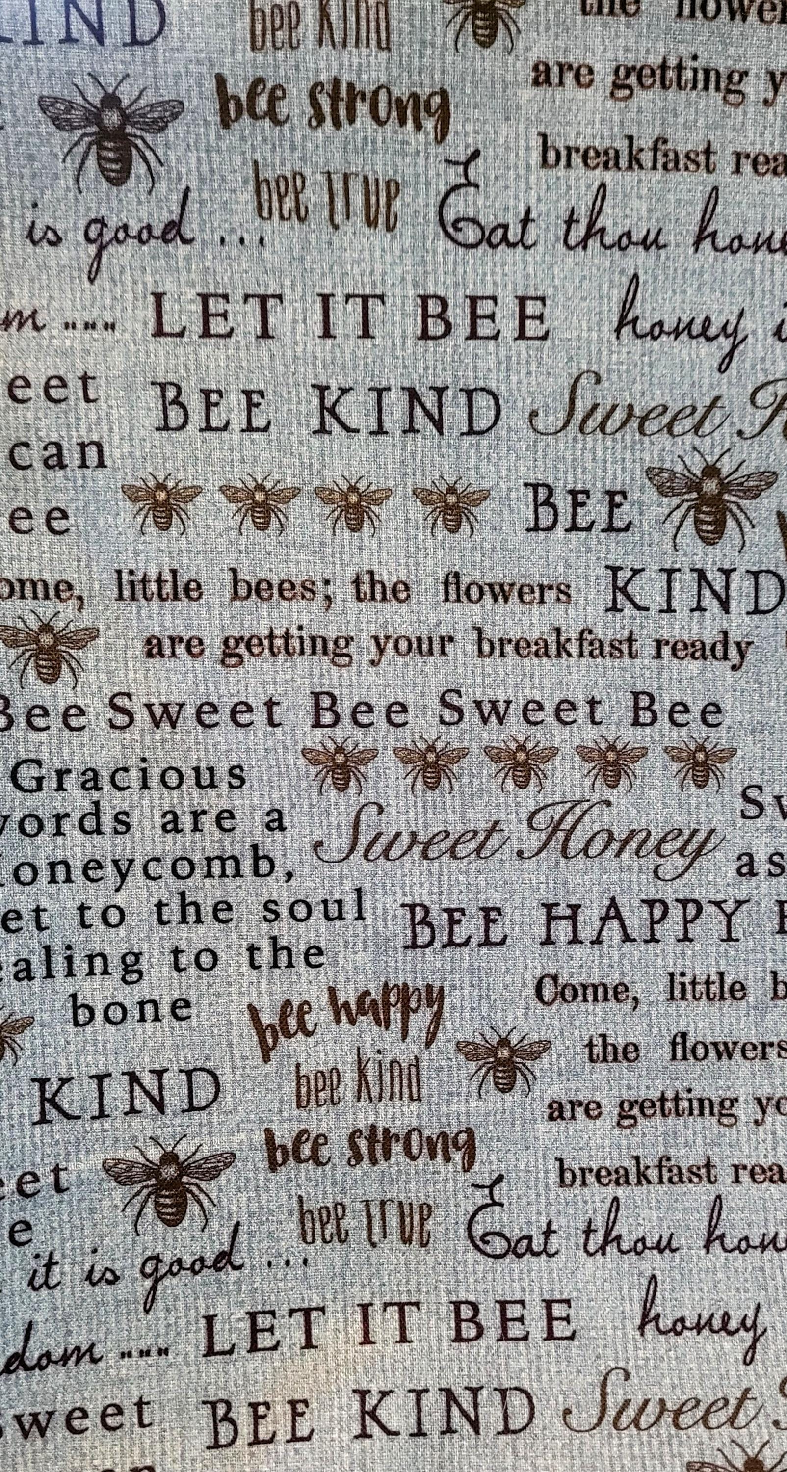 great pkging and arrived fast along with the several other fabs purchased, BUT this particular fabric was NOT the color I thot I was getting. I thot I was getting something on the gray side and when I first saw, it was immediately like a baby blue. I love the message on the fabric. The bees etc but I am really disappointed color was not what I thot it wud be. I needed it for a charity quilt--with the words "BEE KIND." It was perfect, until I saw blue....Now Im blue. I did look it up on site after receiving, and did find the same fab in a cream which I didnt see B4 I ordered. That one wud have been better. Its not a bad review, pkging was great, shipping great, just that this fabric (color) was not what I thot I was getting.