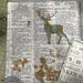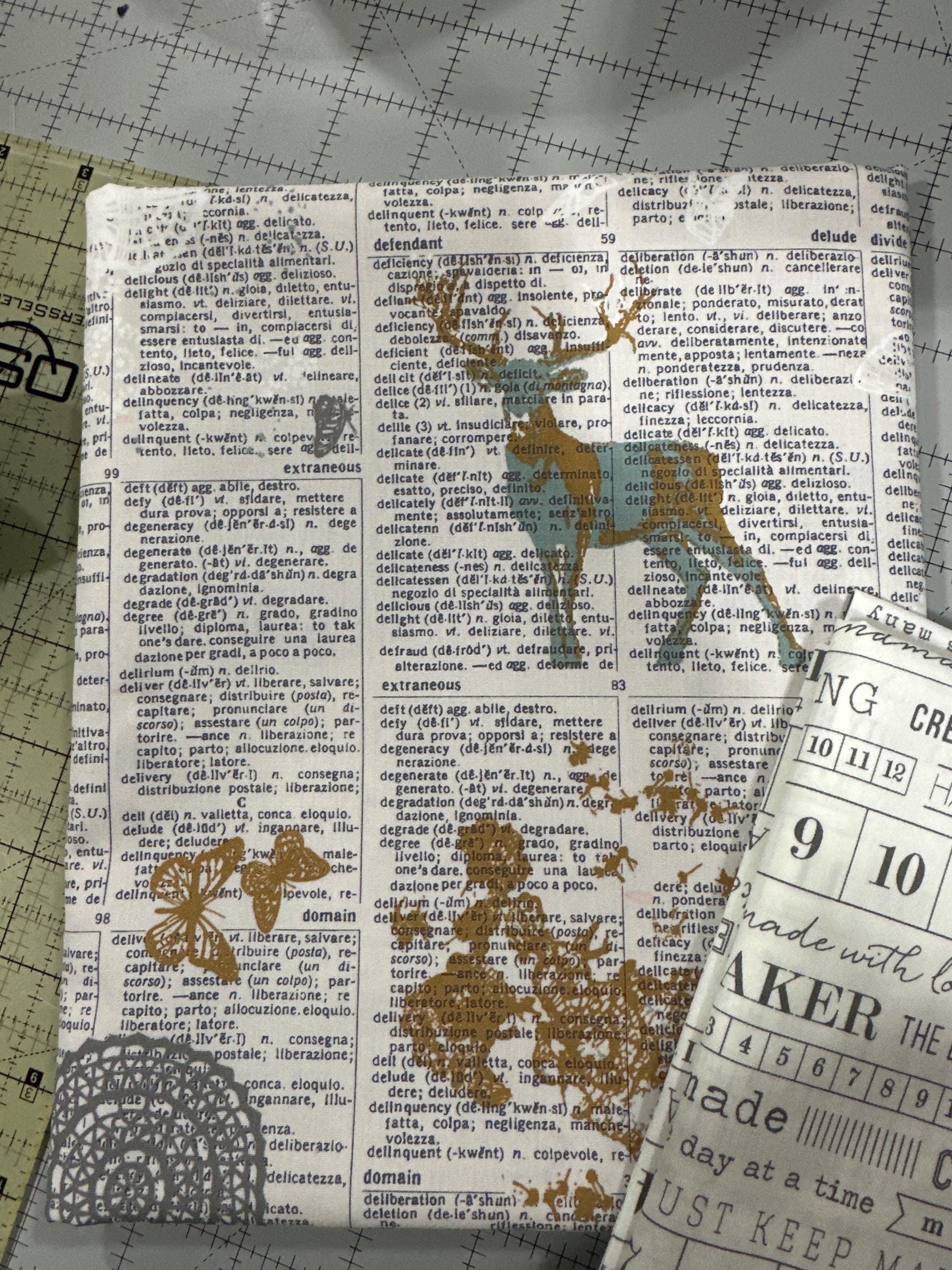 Newspaper background with white, grey, & sage doilies. Sage deer with gold, metallic antlers. Gold, metallic butterflies.